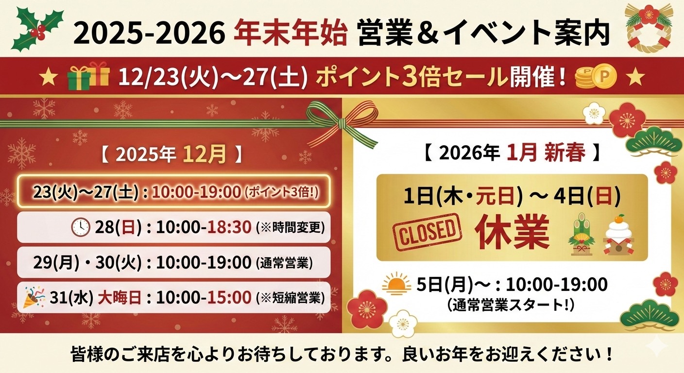 ☆12/23~12/27☆ 日頃の感謝を込めまして『年末セール&ポイント3倍セール』を開催します! ☆12/28(日)☆ 日曜日ですが営業しています! (10:00~18:30) ・地方発送はお休みさせていただきます。(注文は可能ですが年明けの確認になります。) ・配達はお休みさせていただきます。 ☆12/29(月)☆ 通常営業です! (10:00 …